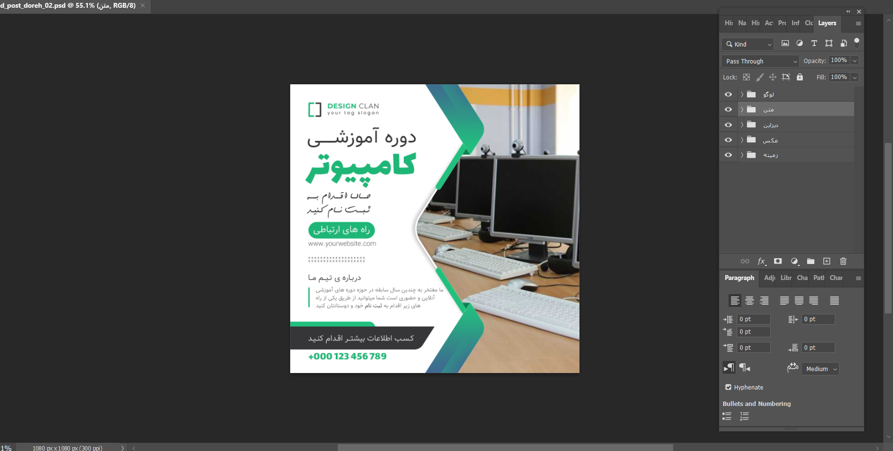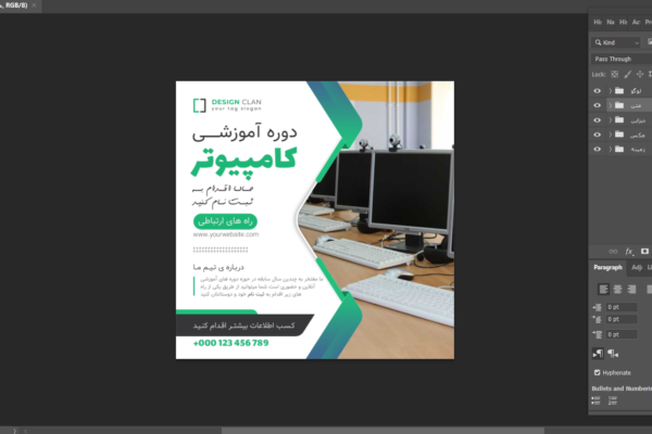 تمامی لایهها کاملاً فارسی، گروهبندی شده و مرتب هستند تا بتوانید خیلی سریع و بدون تجربه زیاد در طراحی، متنها، زمان برگزاری دوره، عکس مدرس، توضیحات، رنگها و المانها را ویرایش کنید.