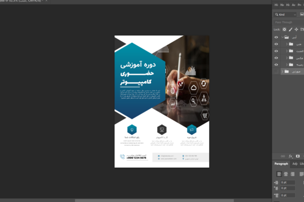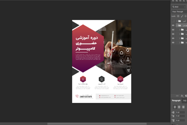 این پوستر با طراحی مدرن و استاندارد، در دو رنگ‌بندی متفاوت ارائه شده تا بتوانید متناسب با هویت بصری برند یا آموزشگاه خود از آن استفاده کنید. تمامی لایه‌ها به صورت کاملاً فارسی، مرتب و نام‌گذاری‌شده هستند و ویرایش متن، رنگ، تصاویر و جزئیات در نرم‌افزار Adobe Photoshop به‌راحتی انجام می‌شود.